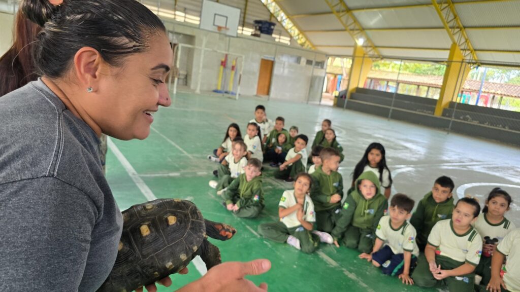 A Escola Municipal Sebastião Vayego de Carvalho promoveu atividade especial de conscientização sobre o bem-estar animal que levou, de forma concreta, a presença de diferentes espécies ao ambiente escolar. Cerca de 300 alunos do Jardim II e dos 1º, 2º e 3º anos participaram da vivência, que contou com a interação direta com um pintinho, um jabuti, um cachorro e um gato.