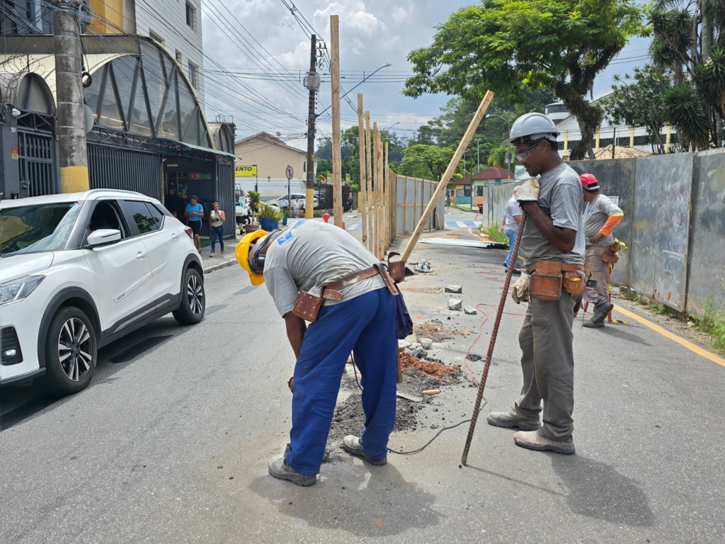 Para garantir a segurança de comerciantes, pedestres e trabalhadores, o espaço está sendo fechado com tapumes, com previsão de conclusão até esta sexta-feira (20). A medida organiza o canteiro de obras e delimita a área onde serão executadas as próximas etapas.